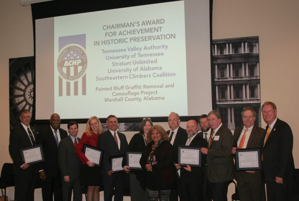 In partnership with the Tennessee Valley Authority and other stakeholders, Stratum Unlimited received the Advisory Council on Historic Preservation’s Chairman’s Award for Achievement in Historic Preservation for the Painted Bluff Graffiti Removal and Camouflage Project at Guntersville Reservoir, Marshall County.
